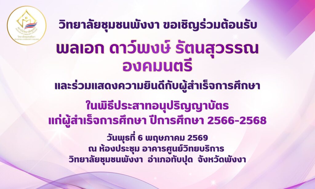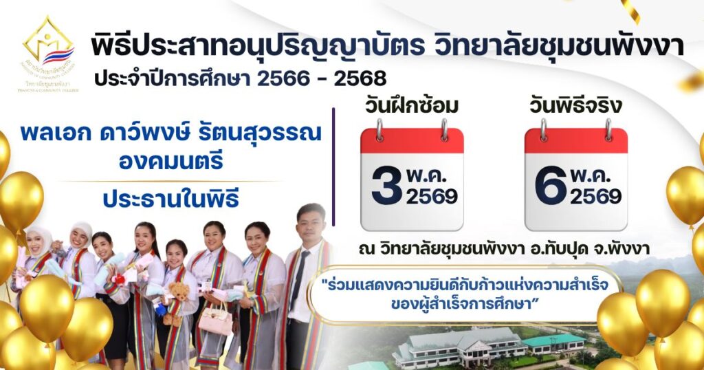 นโยบายวิทยาลัยชุมชนพังงาสีเขียวสู่ความยั่งยืน ประจำปี 2569 ข่าว/กิจกรรม นโยบายวิทยาลัยชุมชนพังงาสีเขียวสู่ความยั่งยืน ประจำปี 2569 webmaster 27 เมษายน 2026 Read More Read more about นโยบายวิทยาลัยชุมชนพังงาสีเขียวสู่ความยั่งยืน ประจำปี 2569