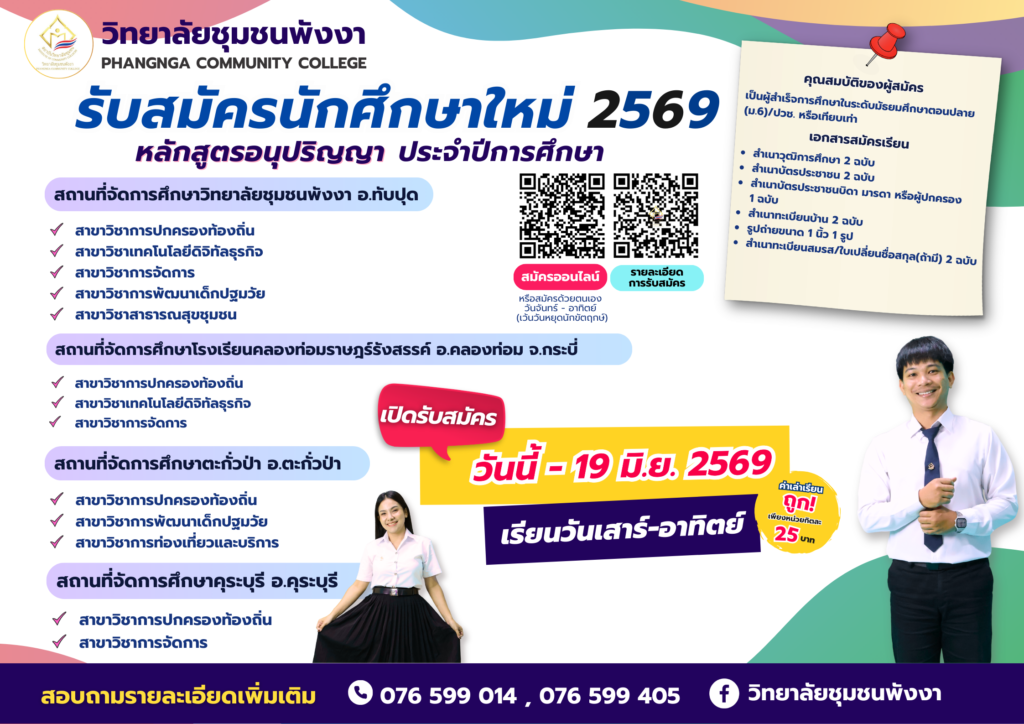การประสานความร่วมมือระหว่างวิทยาลัยชุมชนพังงาและองค์การบริหารส่วนตำบลบ่อแสน ข่าวประชาสัมพันธ์ ประกาศ การประสานความร่วมมือระหว่างวิทยาลัยชุมชนพังงาและองค์การบริหารส่วนตำบลบ่อแสน webmaster 18 มีนาคม 2026 นจันทร์ที่ 16 มีนา Read More Read more about การประสานความร่วมมือระหว่างวิทยาลัยชุมชนพังงาและองค์การบริหารส่วนตำบลบ่อแสน
