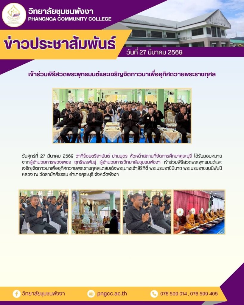 วันศุกร์ที่ 27 มีนาคม 2569 ว่าที่ร้อยตรีสายันต์ ปานบุตร หัวหน้าสถานที่จัดการศึกษาคุระบุรี ได้รับมอบหมายจากผู้อำนวยการพวงเพชร ฤทธิพรพันธุ์ ผู้อำนวยการวิทยาลัยชุมชนพังงา เข้าร่วมพิธีสวดพระพุทธมนต์และเจริญจิตภาวนาเพื่ออุทิศถวายพระราชกุศลแด่สมเด็จพระนางเจ้าสิริกิติ์ พระบรมราชินีนาถ พระบรมราชชนนีพันปีหลวง ณ วัดสามัคคีธรรม อำเภอคุระบุรี จังหวัดพังงา