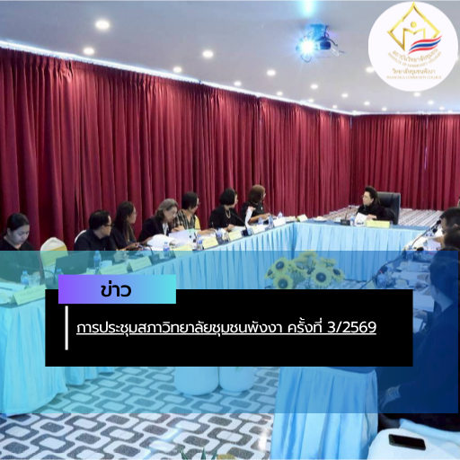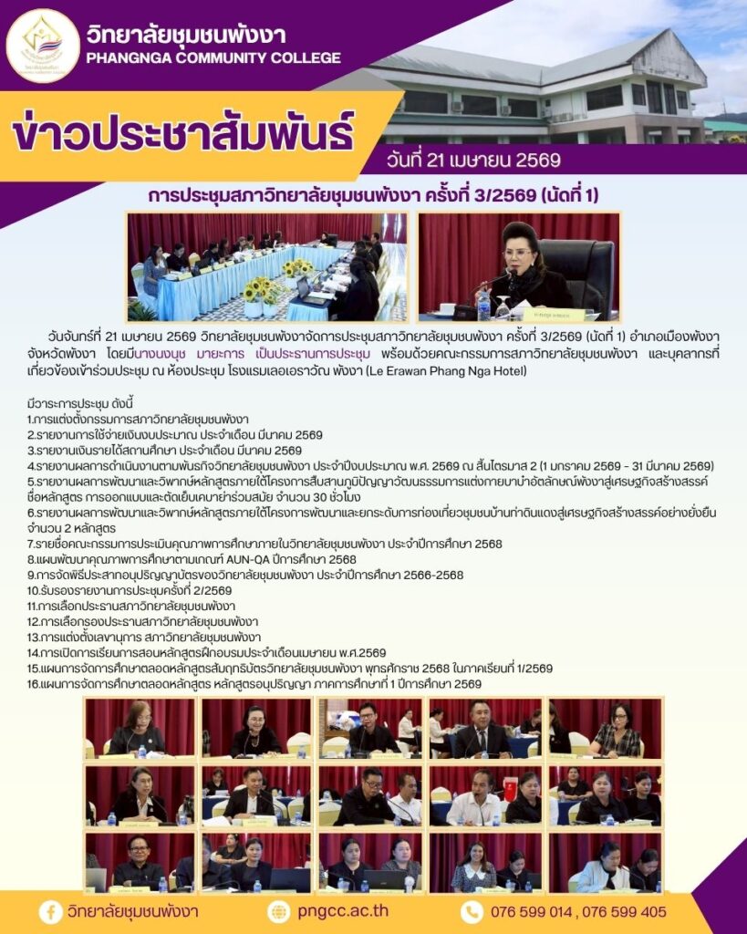 วันจันทร์ที่ 21 เมษายน 2569 วิทยาลัยชุมชนพังงาจัดการประชุมสภาวิทยาลัยชุมชนพังงา ครั้งที่ 3/2569 (นัดที่ 1) อำเภอเมืองพังงา จังหวัดพังงา โดยมีนางนงนุช มายะการ เป็นประธานการประชุม พร้อมด้วยคณะกรรมการสภาวิทยาลัยชุมชนพังงา และบุคลากรที่เกี่ยวข้องเข้าร่วมประชุม ณ ห้องประชุม โรงแรมเลอเอราวัณ พังงา (Le Erawan Phang Nga Hotel)