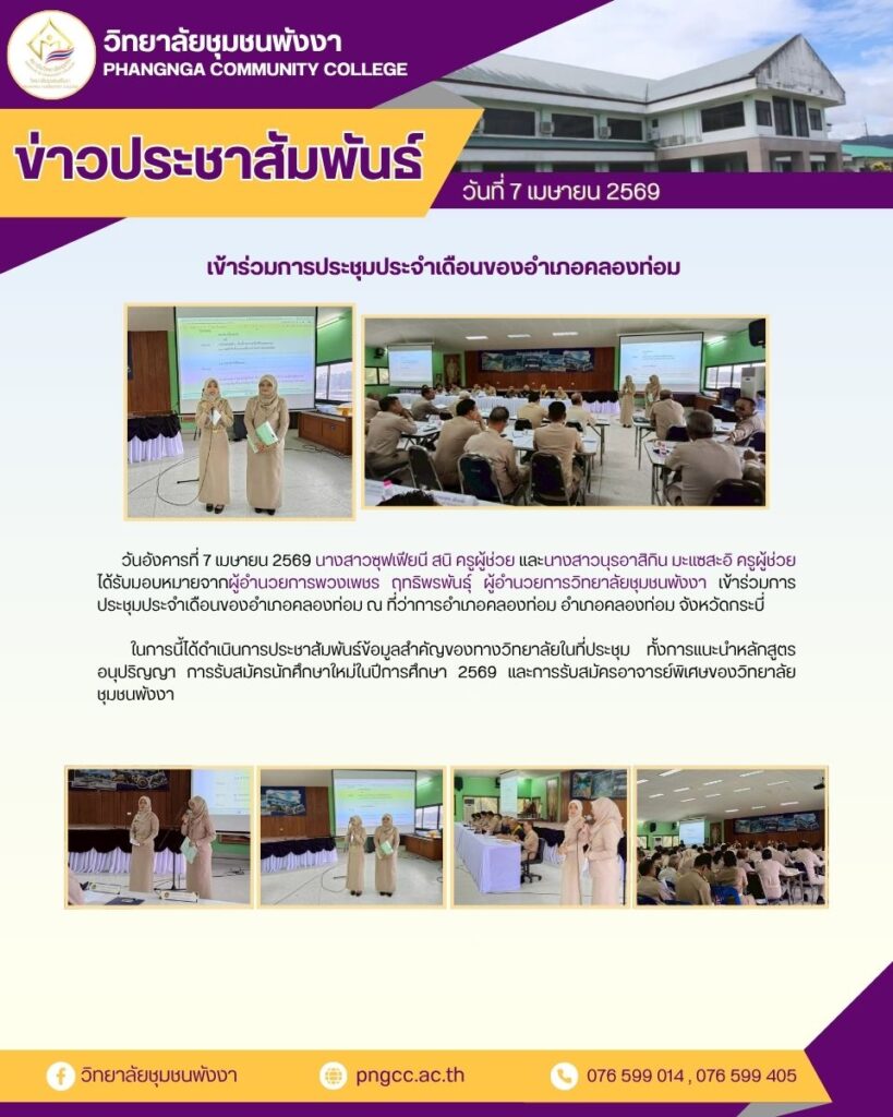 วันอังคารที่ 7 เมษายน 2569 นางสาวซุฟเฟียนี สนิ ครูผู้ช่วย และนางสาวนุรอาสิกิน มะแซสะอิ ครูผู้ช่วย ได้รับมอบหมายจากผู้อำนวยการพวงเพชร ฤทธิพรพันธุ์ ผู้อำนวยการวิทยาลัยชุมชนพังงา เข้าร่วมการประชุมประจำเดือนของอำเภอคลองท่อม ณ ที่ว่าการอำเภอคลองท่อม อำเภอคลองท่อม จังหวัดกระบี่